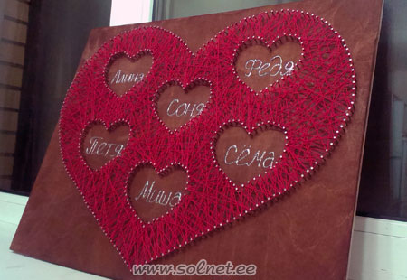 Идея проста: сделать из ниток и гвоздей большое бабушкино сердце, а в нем еще шесть маленьких - по количеству бабушкиных внуков. Картину решили назвать "Бабушкино сердце".